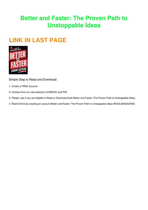 Read Online better and faster the proven path to unstoppable ideas Doc online is a convenient and frugal way to read better and faster the proven path to unstoppable ideas you love right from the comfort of your own home. Yes, there sites where you can get Doc "for free" but the ones listed below are clean from viruses and completely legal to use.